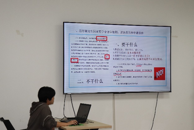 苗龙宇从“要干什么,不干什么”两个方面分享了国奖评选我们需要注意的问题。建议同学们把握时机,做好时间规划安排。最后用一句古诗 “长风破浪会有时,直挂云帆济沧海”来勉励大家勇往直前。